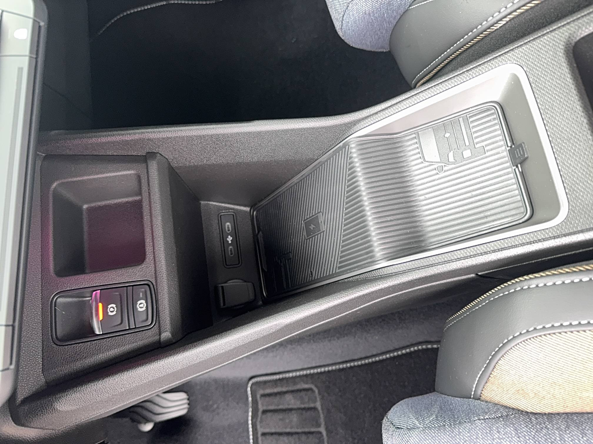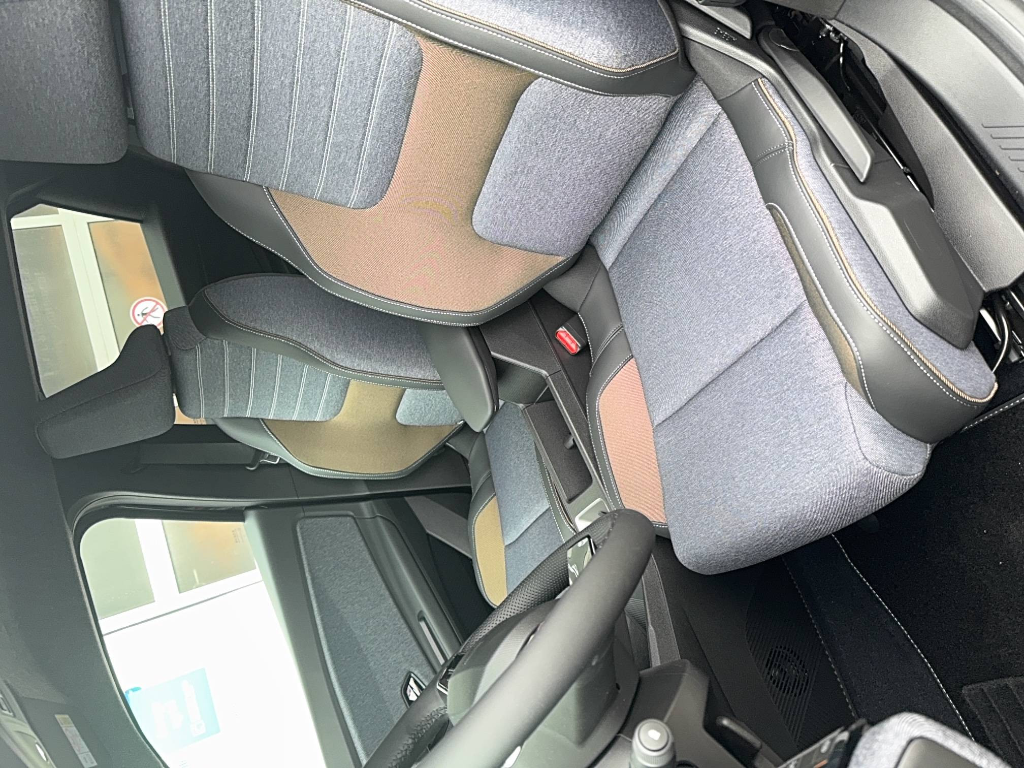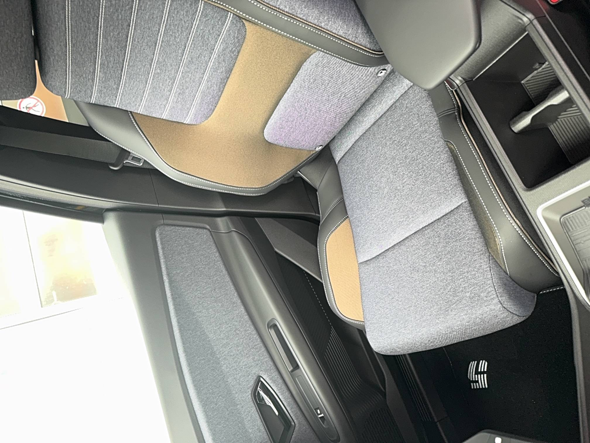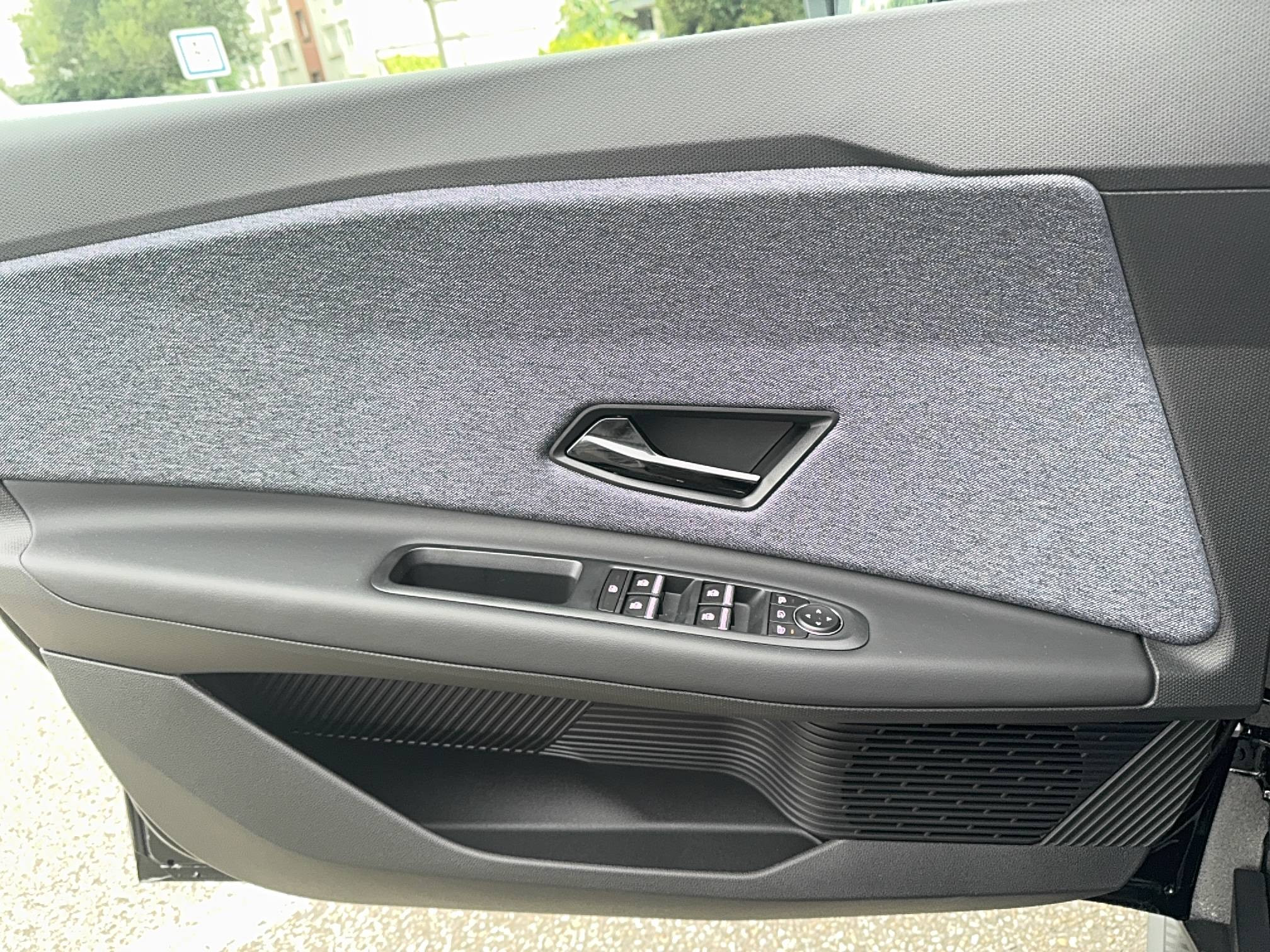 - Sellerie textile 100% recyclé "jean", double surpiqûre grise / ocre et textile refined noir